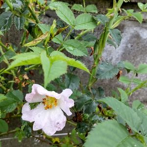 水曜ローズショー•*¨*•.¸¸♬︎ ワイルドローズ ロサ・カニナかな? 秋には小さな赤い実 ローズヒップが 少しですが、できます。 お友達からいただいた一枝から 挿木で大きくなりました。