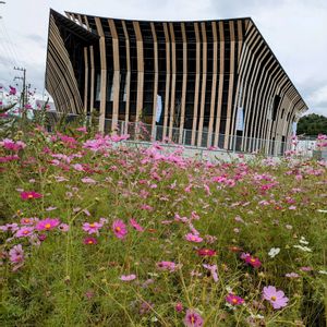 あいの土山の隈研吾先生の建物とコスモス。