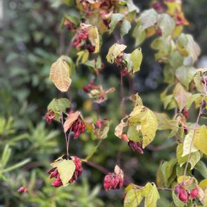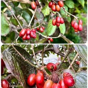 見事に真っ赤な実が鈴なりになっているのは、サンシュユです😍 呼びにくい名前ですけど、元々の漢名「山茱萸」を音読みにしたものなので…茱萸はグミのことで実がグミに似てることの名前のようです。 大きめの実は熟すと生食も出来ますが、果実酒や漢方薬として利用されることの方が多いです。八味地黄丸などの材料のひとつですね。