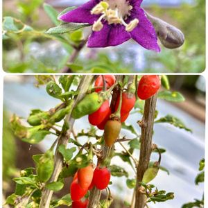 クコの花と実です😍 実が鈴なりになっている株と実がなくて花だけの株がありました。 とても役に立つ有用植物で、実や花は食べれるし(赤い果実は杏仁豆腐のトッピングですね😋)、その実と葉に加えて根皮は漢方薬の材料になります。