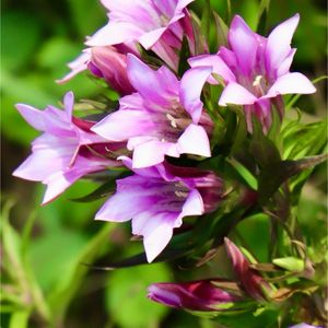 今日のお花 リンドウ ①② リンドウ 竜胆 リンドウ科 リンドウ属 原産地:在来種 (本州、四国、九州) ・山野草 ・薬草 ・多年草 ・草丈:20-80cm ・花期:9-11月 ・花径:約2cm ・花色:青、水色、紫、白、ピンク、中には白い花弁に紫がストライプ状に乗る複色もある ・別名:竜胆(りゅうたん)、ゲンチアナ、ササリンドウ、イヤミグサ ニガナ(苦菜) 花言葉:「勝利」「正義感」「あなたの悲しみに寄り添う」「寂しい愛情」 ③ クサギの果実と夕景