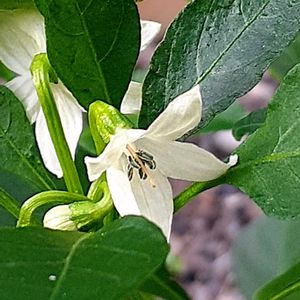 今日のお花 🍀トウガラシ ナス科 トウガラシ属 唐辛子の花色は白色 グリーンの実ができて 赤く色づくと完熟 唐辛子に!