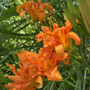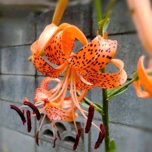 オニユリ(鬼百合)の花言葉∶「情熱」「賢者」「陽気」「愉快」「富と誇り」 別名∶テンガイユリ(天蓋百合) 英名∶tiger lily ユリ科ユリ属🌿 名前の鬼の由来は、花の色が橙赤なのと、外側に反った形を赤鬼に見立てたこと。 【コオニユリとの見分け方】コオニユリは良く似ていて、さほど小さいとも思えない。見分け方は、 ①茎の中程より下の葉の付け根に、黒紫色のムカゴが付いていればオニユリ、無ければコオニユリ。 ②コオニユリは茎に目立った毛が無い。 ③コオニユリは良く結実するが、日本のオニユリは対馬以外では三倍体の為、結実せずムカゴで増える。 鱗茎(球根)は食用とされ、日本で流通している食用ユリの殆どはコオニユリである。昔は飢饉の際の非常食にした。鱗茎は薬草としても強壮•鎮咳•去痰•利尿に用いられてきた。