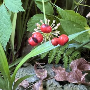 相思子様人参 ソウシシヨウニンジン ウコギ科 トチバニンジン属 分布 北海道、本州、四国、九州 花期 6~8月 もう果実も終盤で少なくなった。(写真①) 竹節状の根茎を持ちチクセツサポニンを含み生薬として用いられる(写真②) 効能 胃のつかえ、消化不良、 食欲不振、気管支炎など。 局所刺激作用がある為 育毛剤に配合されることもあるそう 在来種 日本固有種