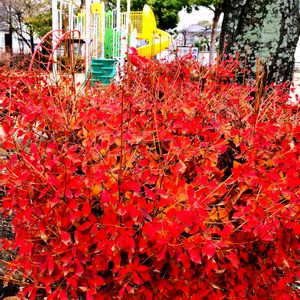 近くの公園のドウダンツツジが紅くてきれいです。 右側の幹はソメイヨシノです。