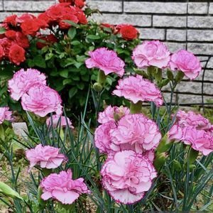 真っ赤なミニ薔薇さんと🌹 地植えのピンクのカーネーション💗 (母の日に娘からのプレゼント🎁) 今年で5年目です୧(୧ˊ͈ ³ ˋ͈)⋆ೄ 今年も綺麗に咲いてくれました💗🎶