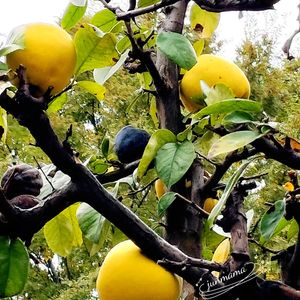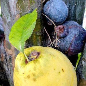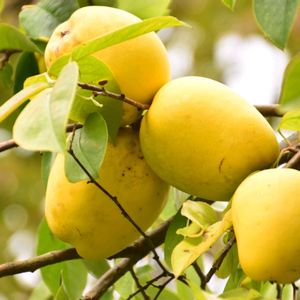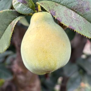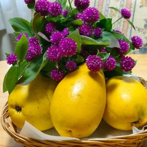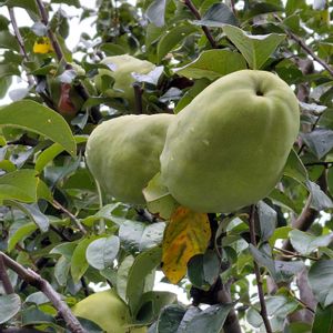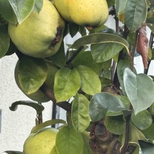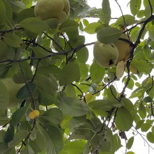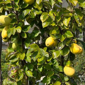 今日のお花「かりん」 お隣の庭で 小さく刈り込んだ木に 巨大なかりんが3個 大きさを誇るように生っています🟡🟡🟡