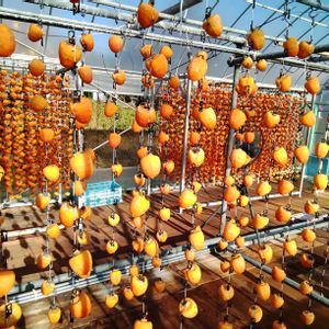 秋の果物。 干し柿🍊リンゴ🍎花梨🍋 吊るし雛じゃないのよ〜😆
