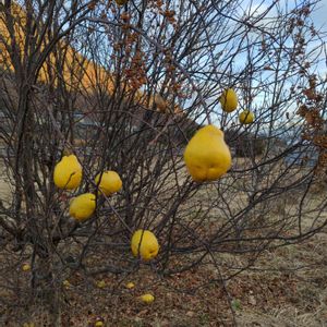 こんにちは。◕‿◕。 葉っぱを落とした木に付いた黄色く色づいたカリンの実が目立ちます 毎年、いつの間にか無くなっています どこへ行くんでしょうね?
