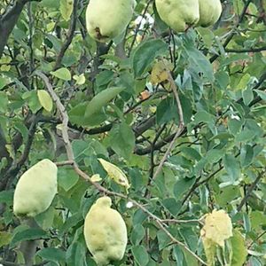 かりん 今の時期たくさん生っています 今年はいつもより多い気が…! 枝が折れちゃいそう😂 折れる前に剪定と実を取らないとね! いい匂い💕