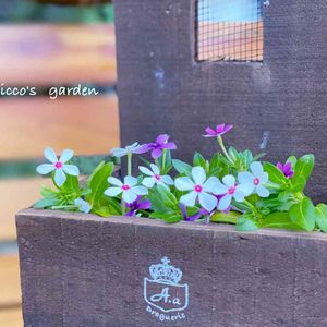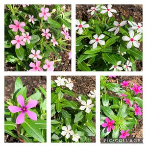 フェアリースター🧚♀️(ニチニチソウ) 花壇に5色植えました😊 小さくて可愛い💕 ↖︎ミルキーピンク ↗︎ホワイト ↙︎ブルー ↓クリアホワイト ↘︎パープル