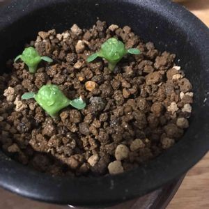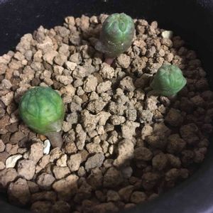 オベサ実生25日目。 たった3週間でここまで成長するとは。 根の一部を傷つけてしまった個体は見事に枯れた。 たとえ横たわろうとも、真ん中からしっかり本体が出てくるまではいじらないほうがいいと思った。 あと発芽用の赤玉土は一番小さいやつでもよかったな。 粒と粒の隙間があると根が折れる気がする。