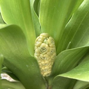 『オモト』 我が家に居付いて十数年、陽当たり不良の場所で生きてます❗ 小さな花芽が3本。 株分け必要でしょうね(^^;;
