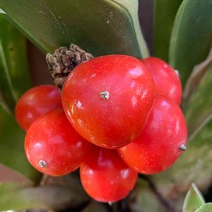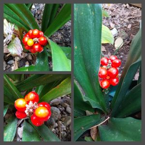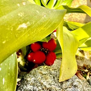 オモト 二つだけだけれど、大きな赤い実をつけていました。 良いことがあるかな🎵
