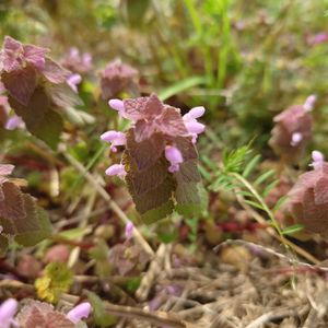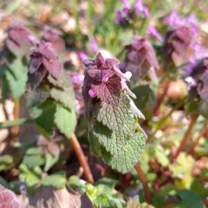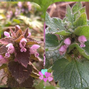 ヒメオドリコソウ💗🥰💗🍃 左 日向 葉が赤らみ小豆色 右 日陰 葉は緑色 2025.3-62