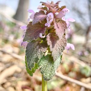 姫踊子草(ヒメオドリコソウ) シソ科オドリコソウ属の2年草。1893(明治26)年に東京の駒場で発見されたヨーロッパ原産の帰化植物。今では日本各地の道端、空き地、河川敷など日当たりの良い場所に群生する。葉を積み重ねた三角錐の形と、シソの葉のような赤紫色は、遠くから眺めてもすぐにわかる。どこでも群生し、しばらく放っておかれた畑などでは絨毯のような景観となる。多くは秋に芽生え越冬してから成長するが、春以降芽生えることもある。葉は重ならないように生える。新しい葉が生えるときは下の葉を陰にしない位置に出る。下の葉ほど葉柄は長く面積が大きく、すべての葉に太陽の光が当たる。葉は花時には暗紫色で、やがて緑色になる。花期は3〜5月。花は淡紫色、シソ科特有の唇形花で上唇と下唇がある。上唇に沿って雄しべがあり、花粉はオレンジ色。下唇の一部が前に突き出て昆虫の着陸場になり、蜜のありかを知らせる濃紅紫色の蜜標がある。種子にはエライオソームがついていてアリが運ぶ。 名前は、踊子草(オドリコソウ)に似ていて小さいため姫が付いた。オドリコソウは花の形を笠をかぶった踊り子に見立てたのが名前の由来。海外ではred dead nettle(トゲのない赤いイラクサ)と呼ばれ、若い茎葉と花が食用にされる。 出典『雑草のはなし』『都会の草花図鑑』『春の野草』『帰化&外来植物見分け方マニュアル 950種』