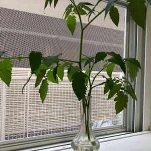 ミニトマト🍅こあまちゃんの脇芽が大きくなりすぎ💦 脇芽に気づかず慌てて摘心しました。 花が咲きそうなので根っこが出るまで花瓶で様子見ます。