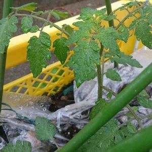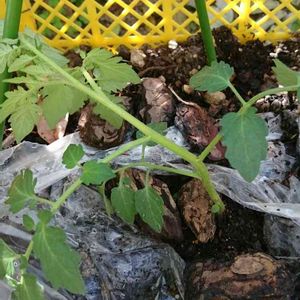 去年トマトを育てたコンテナの土に再生剤と石灰とマリーゴールドの残骸を混ぜて、ビニールをかけたものに植え付けてみました。連作障害が出るのか、実験してみます。