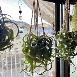 キセログラフィカが欲しくて探していたらカーリースリム(真ん中)と言う葉っぱがクルクルで花茎ピンクの可愛いのを見つけ😲更にストレプトフィラ(右)これも葉っぱがクルクルで可愛いのを見つけてしまった。超クルンクルンだったけど水をあげたら伸び気味に😒キセロを1つ買う予定が3つ大人買いしてしまった😅早速ヘゴに着けて吊るせるようにしたよ。楽しい😆💕✨