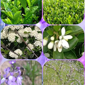 白い花ばかりで3枚目は 温州ミカン🍊の白い花、 スズランは今一番見頃で 白い花 可愛い 😍😍 最後はライスフラワー、 草丈は1メートルも有りますが ピンクの小さな花が咲いてます
