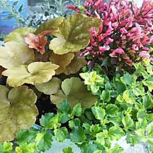 秋らしい寄せ植えにと買ったものの、余ってしまったのでまとめて植えてみたけど… ヒューケラとアキランサス、斑入り葉バコパと金魚草のシルバードラゴン