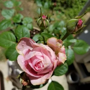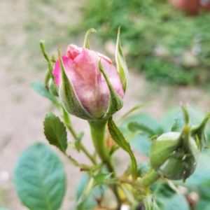 朝の庭p(^-^)q 何年か前に娘からもらったピンクのミニ薔薇❣ 今年も元気に蕾を付けてくれました🎶