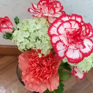 遅ればせながらの母の日プレゼントをカーネーション💐 可愛いカーネーション2色と ミニ紫陽花 薄グリーン 母が今日 ショートステイから戻って来ました😀💐
