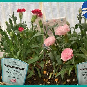 Bonsoir.🌃 我が家のポットカーネーション•プリテ ィシリーズのいちご🍓とさくら🌸🤗 第二弾が咲き始めました🙌🏻😆🙌🏻😆🙌🏻 可愛いですね〜🥰🥰🥰🥰🥰🥰🥰 明日は、こども食堂のボランティア活 動でマック🍟🍔🥤のバイトがOFF の為、マック🍟🍔🥤の園芸担当者が 立て続けに辞めてしまったからお花に 水やり隊メンバーが居ないのです😞 店長とマネージャーさんたちに明日の お花に水を上げる人を選出をお願いし て帰って来ました〜 我が家でも、お花のお世話で楽しんで いますが…🎵