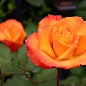 バラ カシスオレンジ🍊 (バラ科) 半剣弁高芯咲きの花はオレンジ色に朱色がのる。春・秋の低温時には朱色が強くのり一輪もしくは数輪の房で咲くそうです🧡🧡❤️💚 鮮やかな彩りでとっても美しい😍 イングリッシュガーデンにて撮影📷