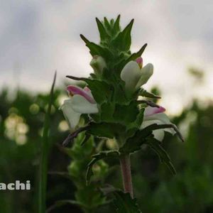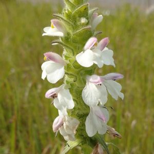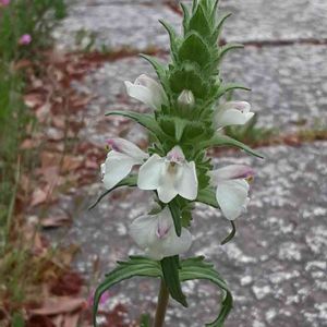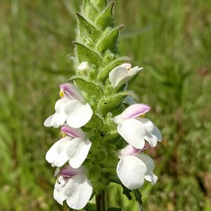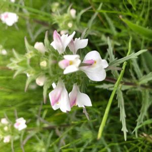久内草(ヒサウチソウ) ハマウツボ科ヒサウチソウ属の越年草。地中海沿岸原産の帰化植物。1982年に名古屋市で見いだされ、すでに、四国、近畿、東海地方の一部に定着している。全体に軟毛と腺毛があり、よく粘る。茎は直立して分岐せず、高さ10~30㎝になる。葉は茎の上部で対生し、葉柄はなく線形~ひ針形で鋸歯があり長さ1.5~9㎝ほど。春から初夏にかけて茎の上部に苞を持った穂状花序を出し、葉状の苞は花序の先に行くほど小型化する。長さ20~25㎝の唇形花の上唇はフード状で淡紫色、下唇は上唇より長く白色で先が2裂している。種子は非常に細かく埃状となる。 自ら光合成する一方で、周辺の植物の根に自分の根を食い込ませて養分をくすねる『寄生』を行う半寄生植物。 ヒサウチソウの名は、帰化植物研究家久内清孝を記念して命名された。 出典『日本帰化植物写真図鑑』『すごすぎる雑草』