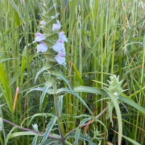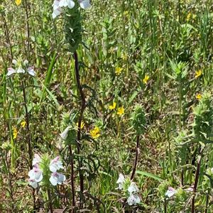 アレチハナガサの足元にたくさんのこの姫が⤴️ この写真の姫は高さ15センチくらい。花は1センチ5ミリくらいでしょうか。 茎は食い散らかしたトウモロコシの芯からトゲトゲが生えてきたようなイメージです。 背丈の割とたかいものもいて、30~40センチくらいの高さのもいました。 シソ科の一種かなと思うのですが、すぐ横に同じ様な見かけの黄色い花を咲かしてるのもはえてました。別でアップします。 名前を教えてください ヒサウチソウと教えていただきました。 ●ヒサウチソウ -----久内草----- ゴマノハグサ科 ヒサウチソウ属 地中海沿岸原産 半寄生の植物で地下で他の植物の根から養分を吸収している。 ヒサウチソウの名の由来は、帰化植物研究家久内清孝氏より 1982年に名古屋市から報告されたのが最初