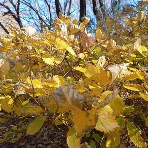 コアジサイ(小紫陽花 )アジサイ科アジサイ属 別名、シバアジサイ(柴紫陽花) 山の公園のコアジサイが黄葉してました。 可愛い冬芽葉痕も見つけました。 関東地方以西の本州、四国及び九州の低山に分布する アジサイの仲間。山地の林内や林道沿いに見られ、 花には園芸品種のアジサイに見られるような装飾花はないものの、アジサイにない甘い香りを放つことや、アジサイほど大きくならないことから庭木として使われる。 葉は長さ5~8センチでアジサイより小さく、枝から対になって生じる。縁に大きなギザギザがあるのが特徴。葉の両面に細かな毛があり、触れるとザラザラする。また、若い枝は紫色を帯び、細かな毛が上向きに生える。 コアジサイの開花は6~7月。花は全て両性花で、直径は4ミリほど。多数が半球状に集まって直径5センチほどの花序を作る。花色は薄い青紫色が基本だが、色の濃淡には個体差がある。派手な装飾がない分、梅雨のジメジメした時期に涼しげな印象を与える。 🏷 日曜ビタミンカラー♪