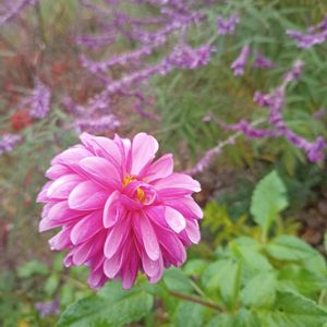 修善寺虹の郷のお花たち 雨が降ってましたが、頑張って周ってきました。 1⃣ ピンクのダリアとアメジストセージ 2⃣ バラのアーチが綺麗でした。 3⃣ ピンクの一重のバラ バレリーナ 4⃣ アメジストセージ 奥に見えるのはラクウショウ 5⃣ イギリス村とイギリスの国旗の花壇 🏷 木曜日は桃色 🏷 ピンクワールドへようこそ