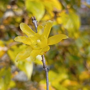 ソシンロウバイ(素心蝋梅)ロウバイ科ロウバイ属 先日蕾だったロウバイ、お花が咲いてました。 ソシンロウバイ、10個以上は咲いてました。 まだ葉っぱも黄葉して残ってます。 5⃣ 冬芽葉痕です。 ソシンロウバイはロウバイの品種。 内側の花被片が赤色を帯びない。 花もやや大きく、ロウバイより多く栽培されているそうです。 🏷 日曜ビタミンカラー♪