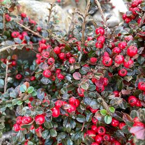 ベニシタン バラ科 常緑樹 中国西部を原産50種以上あるコトネアスターの代表的な木。 日本に渡来した時期は明治初期。 樹高が低いわりに色鮮やかな実がなることや繁殖が容易なことから、庭木、盆栽、鉢物として広く普及する。 日本に渡来したのは明治初期。 赤い実が木を覆うようにできる様を、インド原産で紅色の染料となるシタン(紫檀)の木になぞらえ、 ベニシタン(紅紫檀)と名付けられた。 ベニシタンの葉は長さ5~15ミリの小さな卵形。ツゲとよく似た雰囲気を持ち、枝から互い違いに整然と密生する。革質で表面は光沢のある濃緑色。裏面と葉柄には毛を生じる。 常緑樹だが、寒冷地では秋に紅葉の後、落葉する。このため半常緑性あるいは落葉性とすることもある。
