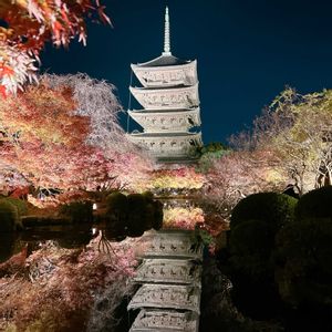 東寺のライトアップ 今回の最大の目的‼️ 春の桜の時、行きたかったのに夜まで体力が持たずに泣く泣く諦めた東寺 五重塔と紅葉が浮かび上がり 幻想的な景色がこの世の物とは思えないくらい素敵✨ 17:30に並び 18:00開門で18:10には入れました❗️ 並んでる時も中国の渡航自粛のせいか前も後ろも日本人 すれ違う人も日本の方が多かったです😊