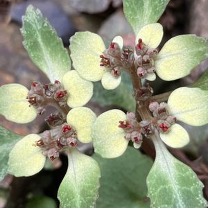 2025/4/3撮影 ヨゴレネコノメ ユキノシタ科 イワボタンの変種 太平洋側に分布することから、熊本県のお隣の宮崎県まで、小遠征。 花序が離れてつくとありますが、この地域のは、花序が集まっており、いがりまさし氏達により、今後、種の見直しがあるかもしれません。 花序の雄蕊の葯の紅色が特徴的。 これまで会う機会がなく、気になる花でした。 花序の下の苞の黄色と茎葉のごげ茶色🟤から濃い深緑のコントラストが強いため、すぐに見つけることができると思っていましたが、意外にも落ち葉に同化して、見つけるのに難渋しました。 4枚めは、3枚めと同じ個体の遠景です。この個体は、特に花の咲く前のためか、苞葉の黄色が目立たず、とても分かりづらい花でした。