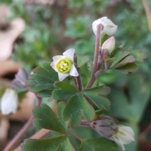 昨日山道に咲いていた 🤍ヒメウズ🤍 オダマキに似た花姿ですが 花径5mm草丈10cmほどの 小さなものです。 俯いて咲く花姿が 奥ゆかしい この花を見つけると 本当の春の到来を感じます *☼𖤣𖥧𖡼.𖤣𖥧☼* 𖤣𖥧𖡼.𖤣𖥧☼姫烏頭(ヒメウズ)☼𖤣𖥧𖡼.𖤣𖥧 キンポウゲ科 ヒメウズ属の多年草 別名 トンボソウ