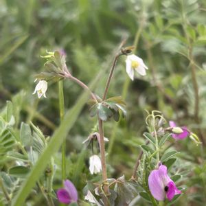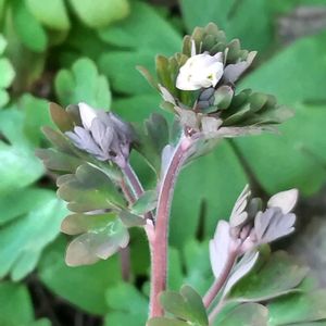 姫烏頭(ヒメウズ) キンポウゲ科ヒメウズ属の多年草。日当たりのよい土手、道端、石垣の間などに生える。根生葉は3出複葉で長い柄がある。小葉は2~3裂し、裂片はさらに浅く2~3裂する。花期は3~5月。オダマキに似た5㎜ほどの小さくてほんのり紫がかった花を下向きに咲かせる。花弁のように見えるのは5枚の萼片で、中心で雄しべを筒状に囲んでいる部分が花弁。果実は袋果で、3~4個が花とは逆に上向きにつく。袋果には種子が10個ほど入り、風に揺れたり雨粒が当たると散布される。 ウズとはトリカブトのことで、花のいちばん上の帽子状の部分がカラスの頭に似ていることから漢名で『烏頭』と書いた。ヒメウズとトリカブトの花は似ていないが、果実はよく似ていて、小さいから姫がついてヒメウズになったとする説がある。また、地中の塊茎がトリカブトに似ていて小さいからヒメウズになったとする説もある。 出典『春の野草』『散歩の草花図鑑』『野に咲く花』『野草の名前』