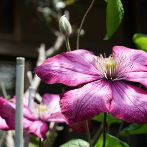 我が家のクレマチス💜 先日投稿した紫のクレマチスより小ぶりで蕊が赤っぽい! 右側は、クレマチス.ビルドリオン!