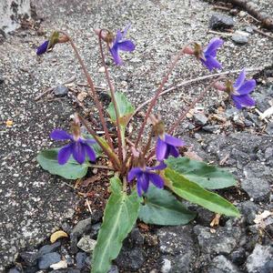 よく写っていないですが。 歩道の舗装の割れ目まからけなげに顔を出しているのに感動して。 これは、ヒメスミレではないかと?