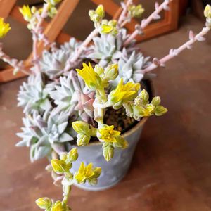 こんばんは🌙😃 【ダドレアグリーニー】の花が咲いたよ~💛レモン色の花🍋 色白な葉との組み合わせが良い😁👍