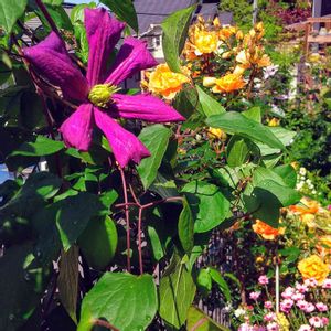 クレマチス👑No.4👑 💜 ジョルマ✨💜✨ ✨4番目 咲き出しました💕 こちらクレマチスさん 実際は…深い紫色で💜 ひとつ前の🍽pic✨で… テーブルに飾りました あれが本当の色になります 🌼💜( ✿˘︶˘✿ ) 💕♬* 毎年…花付きも良く 初冬まで咲く🌼💜🌼 👑がんばり屋さん👑