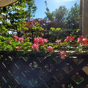 誘引したつるバラがみごとに咲いてます🎵 西日に花びらが透けてまたいい色あいに(*^^*)