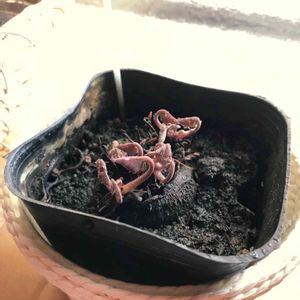 ガーデンシクラメン、2度目の夏越し♪ 今回は完全に水を切って冷暗所にて保管。 2日前に水をやり、復活待ち。 なんか葉っぱになりたかった子が白い触手になってるんだけど、こんなものなのかな?