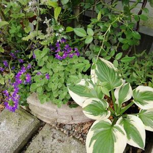 玄関前の小さな花壇その後😙 サンクエール🌼 アロマティカス🌿 ホスタ ワイルドブリム🌿 共にグングン成長‼️ しか〜し🙄 期待のサルビア ネモローサカラドンナさん…成長してるのかしら😂 でもよく見るとチラホラ新芽が出て来てた😁