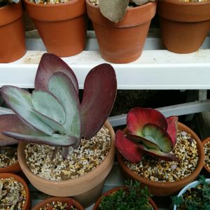 デザートローズ(唐印) カランコエだけど、けっこう強いコ❢ そしてデカくなる( ̄∀ ̄) 右下は上の画像の子供\(´ω` )/ 左下は唐印錦 今はまだ紅葉の赤が強いけど、もう少し褪めてくると、色のコントラストがとっても綺麗。