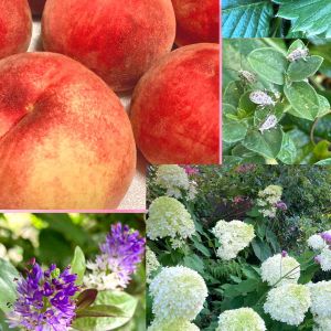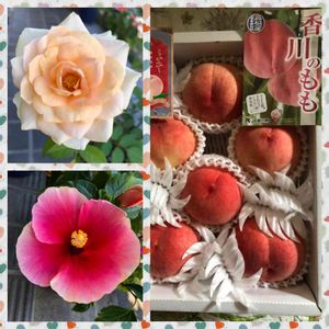左上 ミニ薔薇 コルダーナ 左下 ハイビスカス🌺サマーブリーズ 右 ふるさと納税で香川県の桃🍑を送っていただきました。すごく大きくて、美味しくて甘い、三拍子揃った🍑でした😍🙌😍