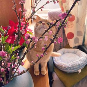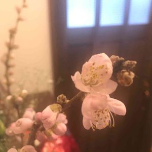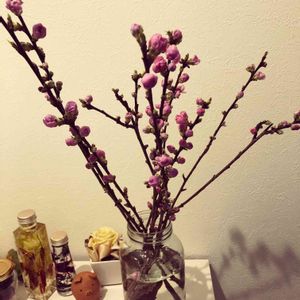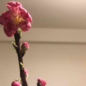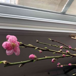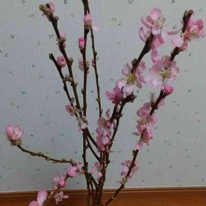 玄関に飾っている桃の花が開いてきました♪ 今日は春のような陽気ですね^^