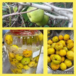 畑の塀沿いに種から増やしたクサボケ(シドミ)があります。今年はやっと実がたくさんついたので、果実酒にしました😊💕💕風邪のひき始めの喉の痛みや咳に効きます😷
